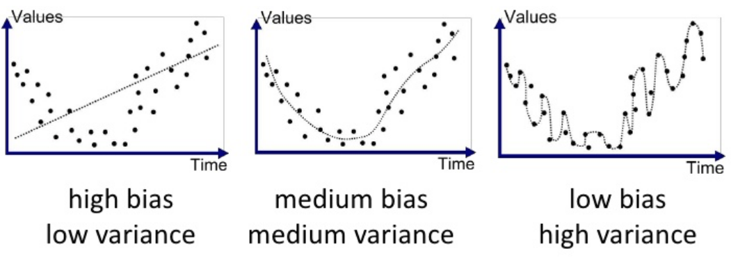 편향(bias)과 분산(variance) 편향은 bias, 모델이 예측하는 값이 정답으로부터 얼마나 멀리 떨어져있는지 나타낸다. 분산은 variance, 모델이 예측하는 값들이 얼마나 서로 비슷한지 나타낸다. 모델의 예측값이 정답과 가까울수록 편향이 낮고, 예측값이 일정할수록 분산이 낮다. 편향과 분산은 모델이 ‘복잡하게 생긴 정도’와 관련이 있다. 아래 이미지는 회귀 모델의 정답(점)과 모델의 학습 결과(선)을 그래프로 나타낸 것이다. 셋 중 가장 나은 모델은 가운데 모델이다. 선이 정답과 가까우므로 편향 양호, 선이 지나치게 구불구불하지 않으니 분산도 양호하다.[이미지 1] 회귀 모델의 편향과 분산에 따른 결과 그림아래 이미지는 분류 모델을 위와 같은 방식으로 나타낸 것이다. 위와 마찬가지로 가운데 모델이 가장 양호하다.[이미지 2] 분류 모델의 편향과 분산에 따른 결과 그림