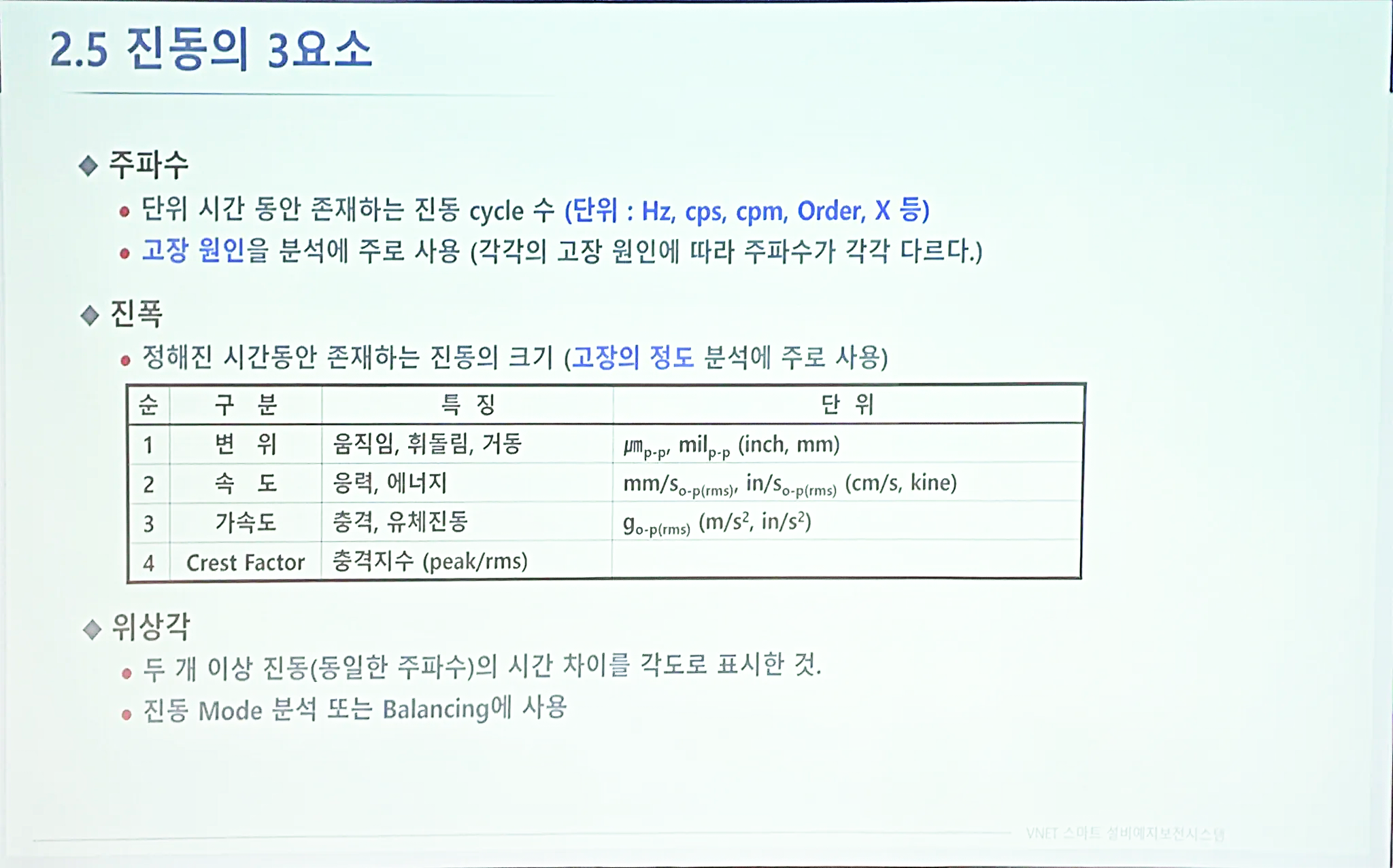 순번 구분 특징 1 변위 움직임, 휘돌림, 거동 2 속도 응력, 에너지 3 가속도 충격, 유체진동 4 crest factor 충격지수 - 단위 중 p-p는 피크 투 피크, p는 피크, o는 원점을 말함