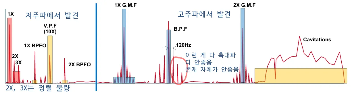 - GMF는 기어 물림 주파수. 기어가 안맞으면 2X, 3X GMF가 나타난다.