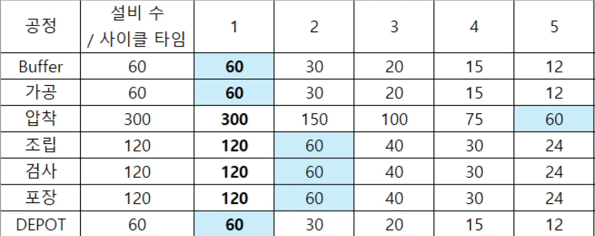 완벽하게 라인밸런싱을 맞추려면, 하나의 셀에 압착기가 5대, 조립, 검사, 포장설비가 각각 2대씩 들어가야 한다.