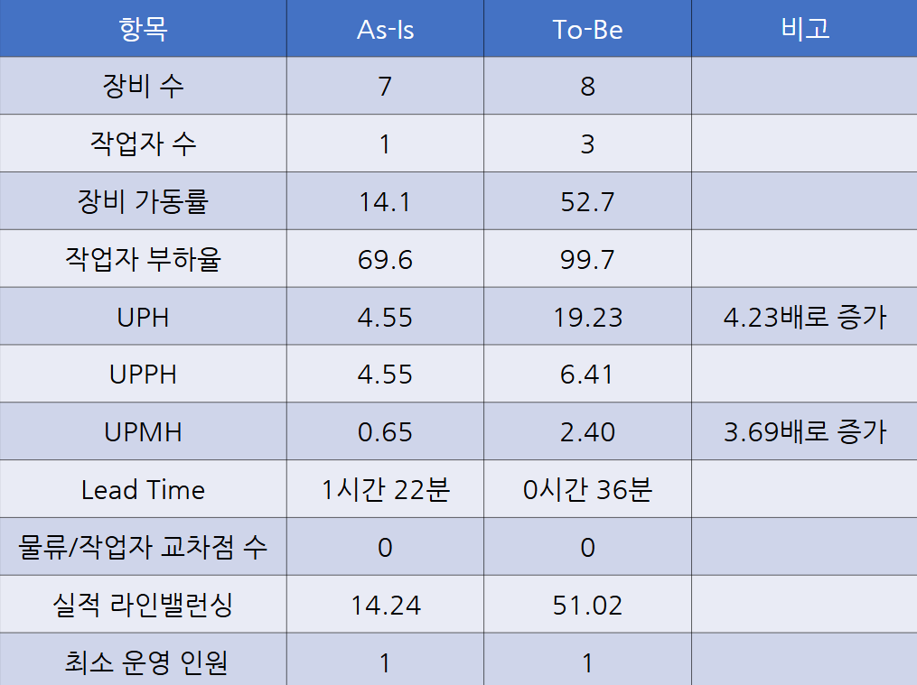 그 결과 UPH는 19.23으로 증가하였으며, 총 생산기간은 2일 3시간으로 목표를 달성한 것을 확인할 수 있다.