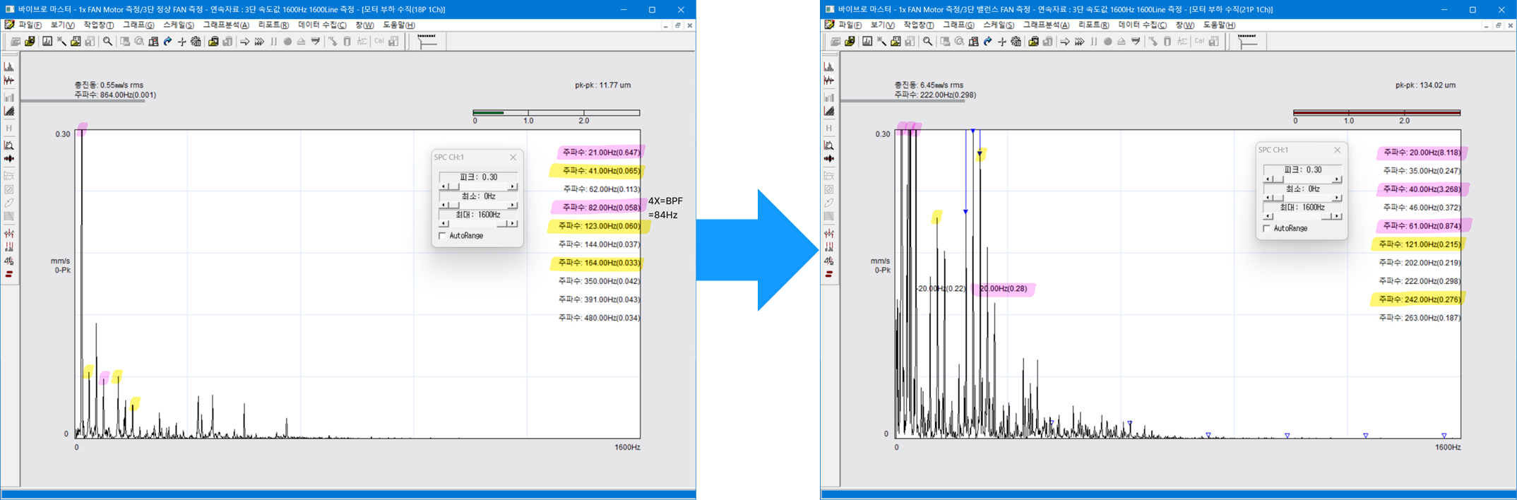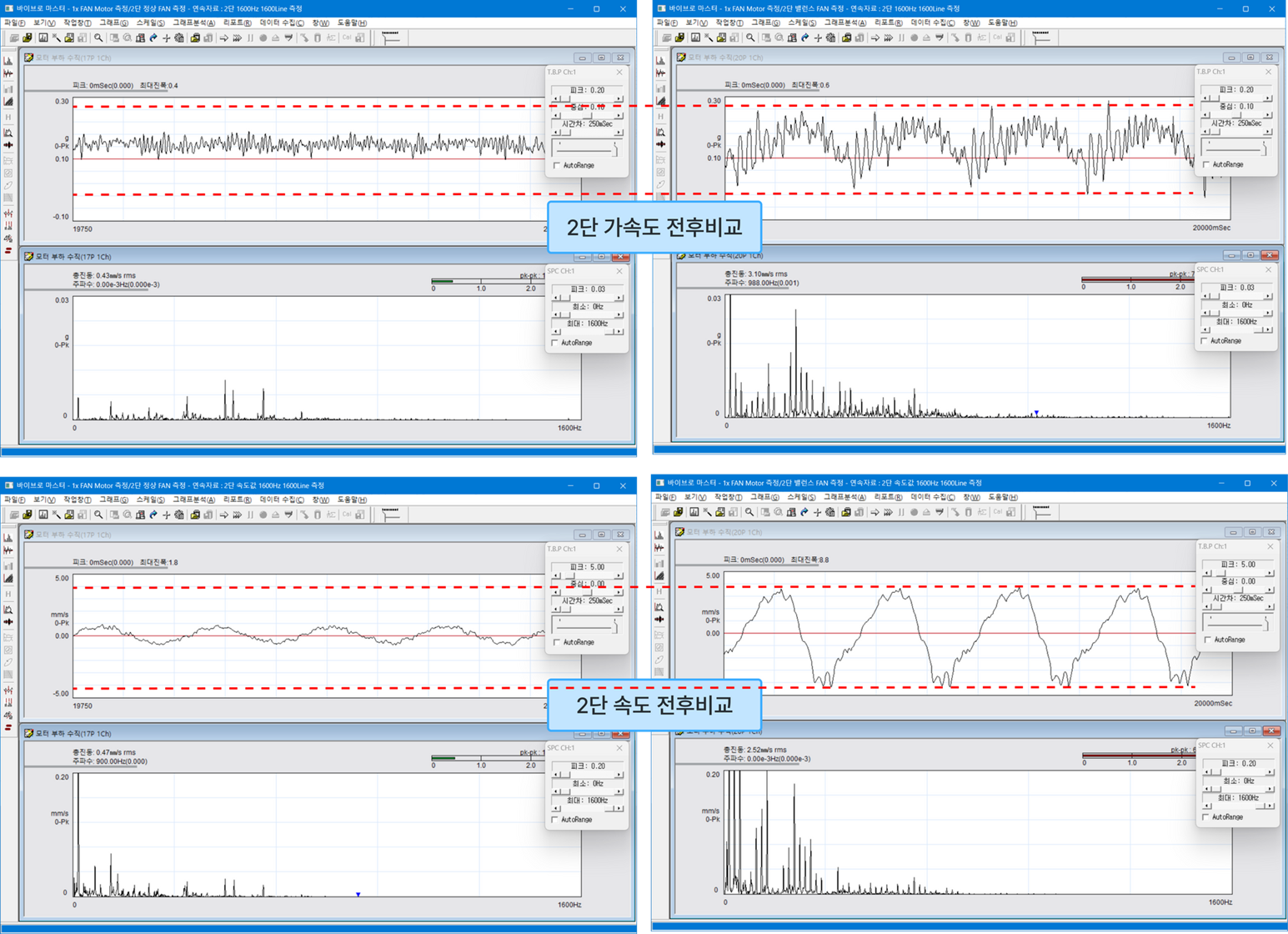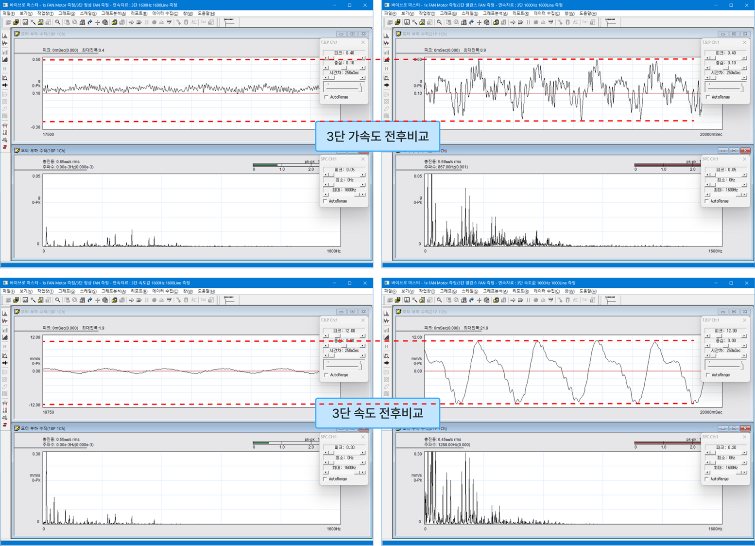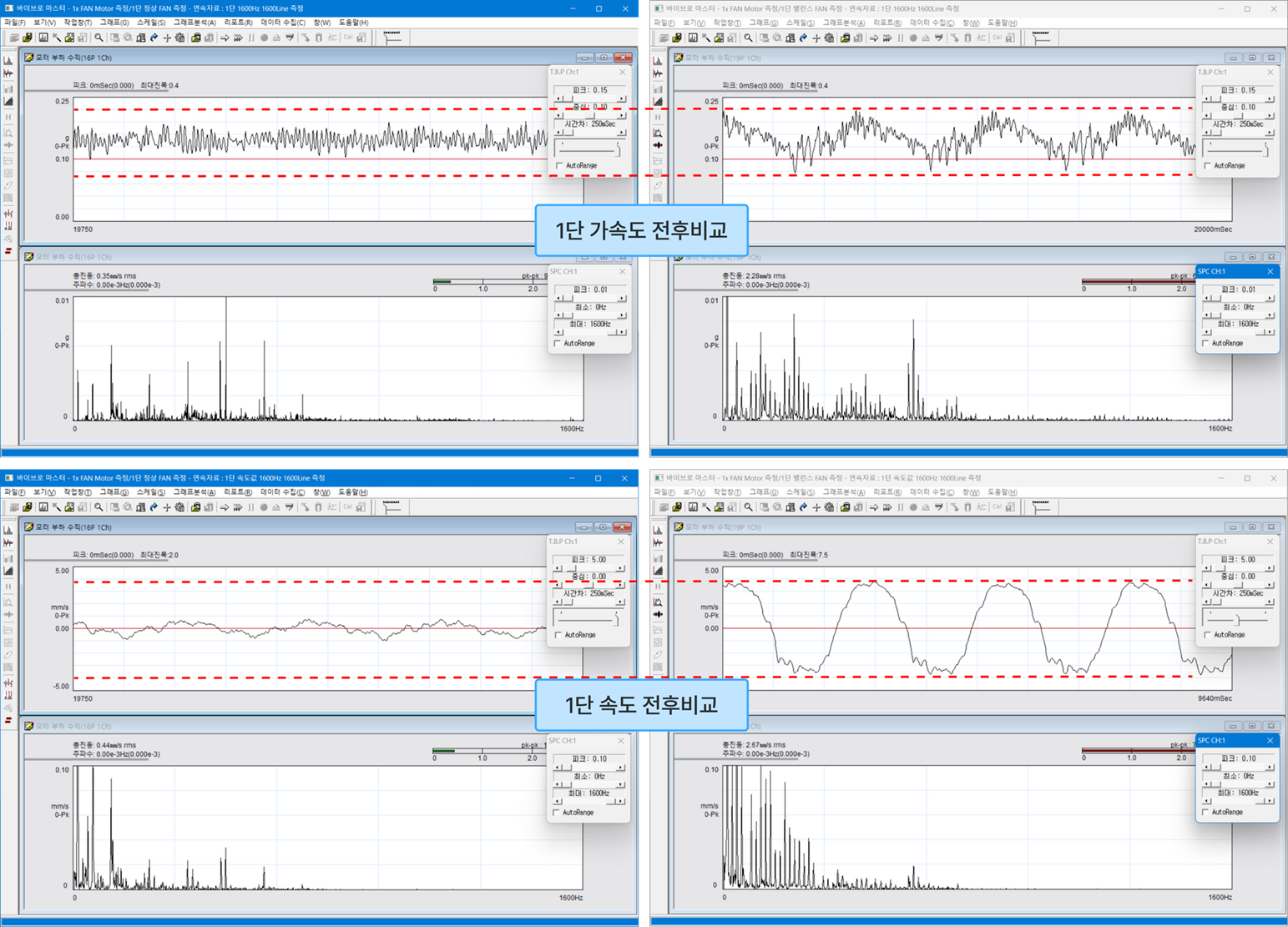 - 단수 별 불평형 전후 진동 스펙트럼 비교 → 당연히 진폭이 크게 상승하고 주파수 그래프가 지저분해짐