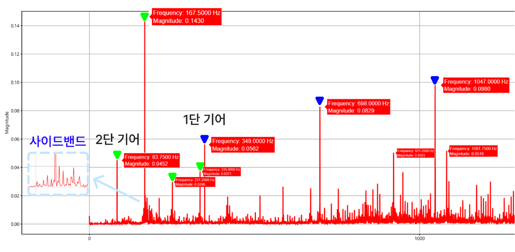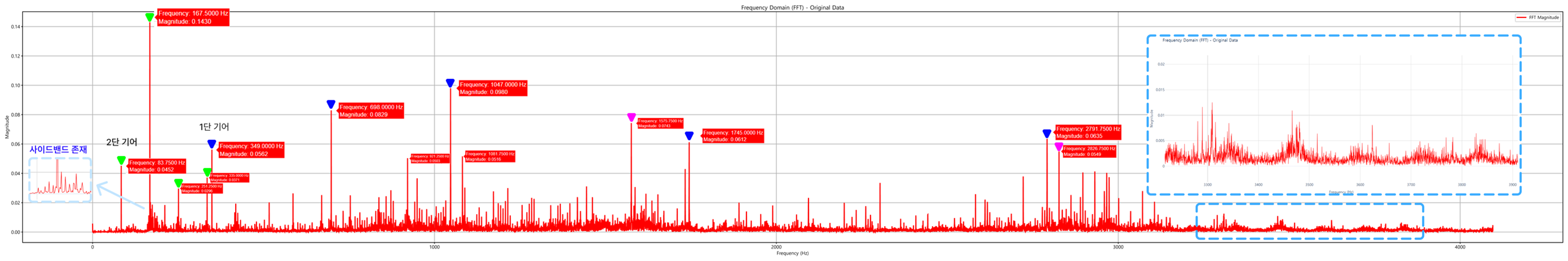 - 사실 1단 기어 주파수와 2단 기어 주파수 피크 표시는 짐작하여 표시한 것임. 왜냐? 기어 이빨 갯수도 몰랐으니까. 강사님의 도움을 많이 받았음.