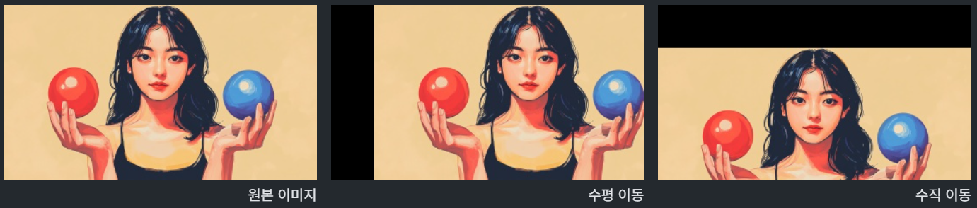 \[\begin{bmatrix} x' \\ y' \end{bmatrix} = \begin{bmatrix} a_{00} & a_{01} & b_0 \\ a_{10} & a_{11} & b_1 \end{bmatrix} \begin{bmatrix} x \\ y \\ 1 \end{bmatrix}\]- 선형 변환(a)과 평행 이동(b)을 합친 것
