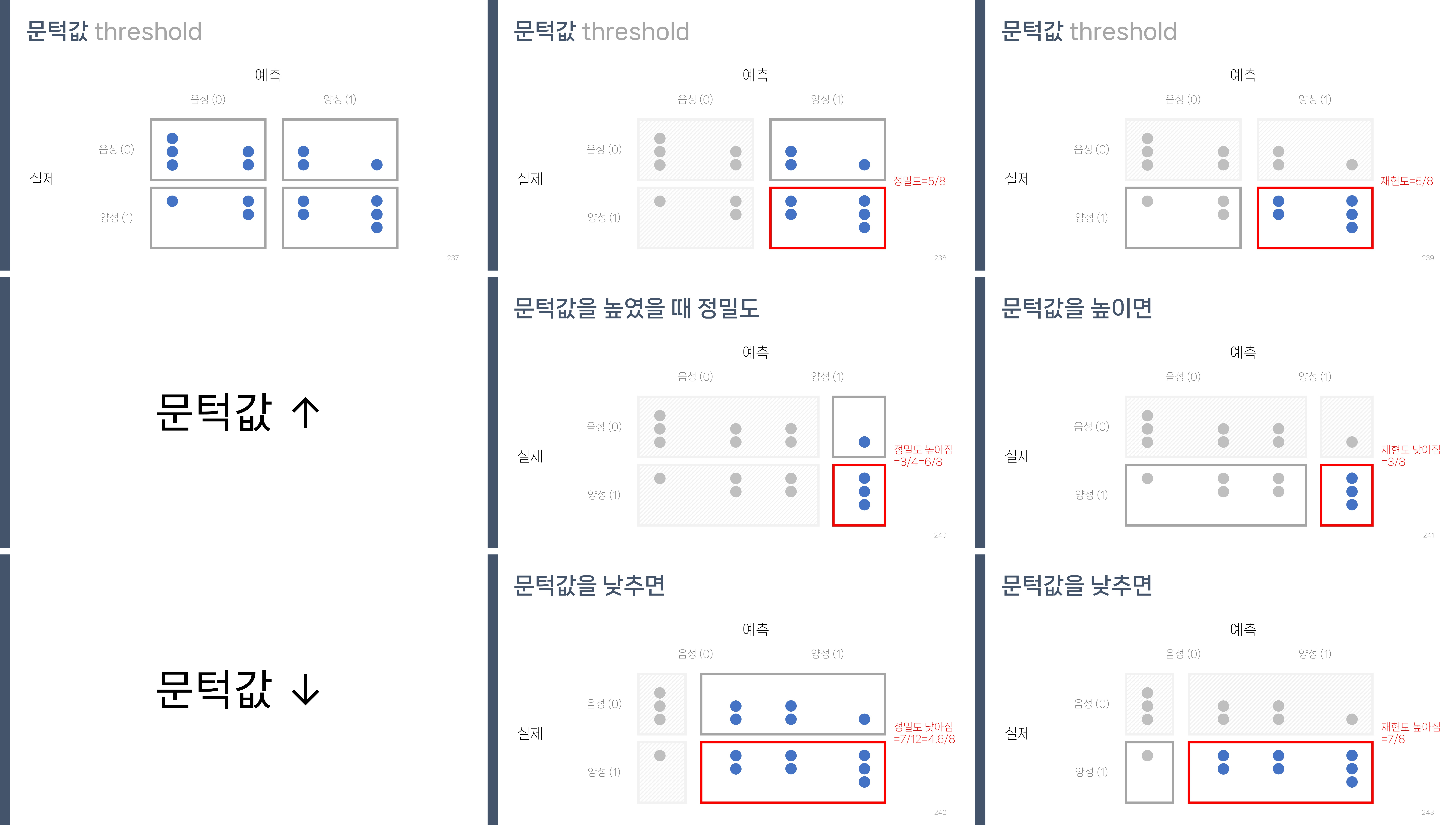 - 정밀도, 특이도는 문턱을 높이면 높아짐