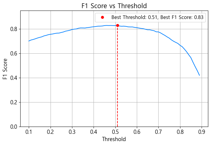best_threshold = ths[i] # 가장 큰 F1 점수의 임계값
