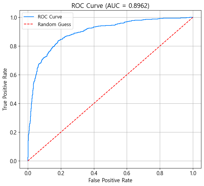 - 곡선하 면적(Area Under the Curve; AUC)은 0~1 범위 → 클 수록 높은 성능